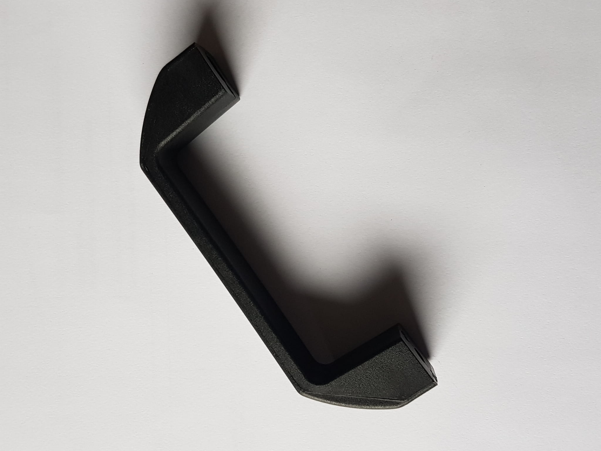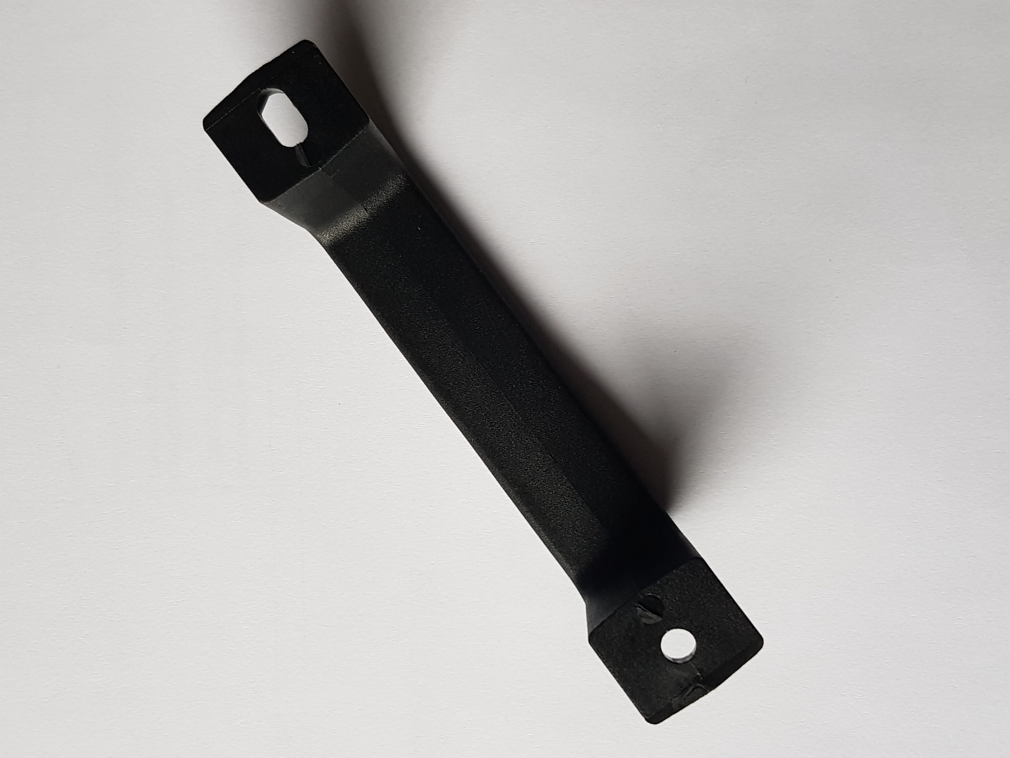 Klamka - uchwyt, plastikowy, czarny. Wymiary - długość 14cm, wysokość 4cm, szerokość 2,5cm. Klamkę mocujemy do drzwi lub okien za pomocą dwóch wkrętów. Klamka o mocnej masywnej budowie.