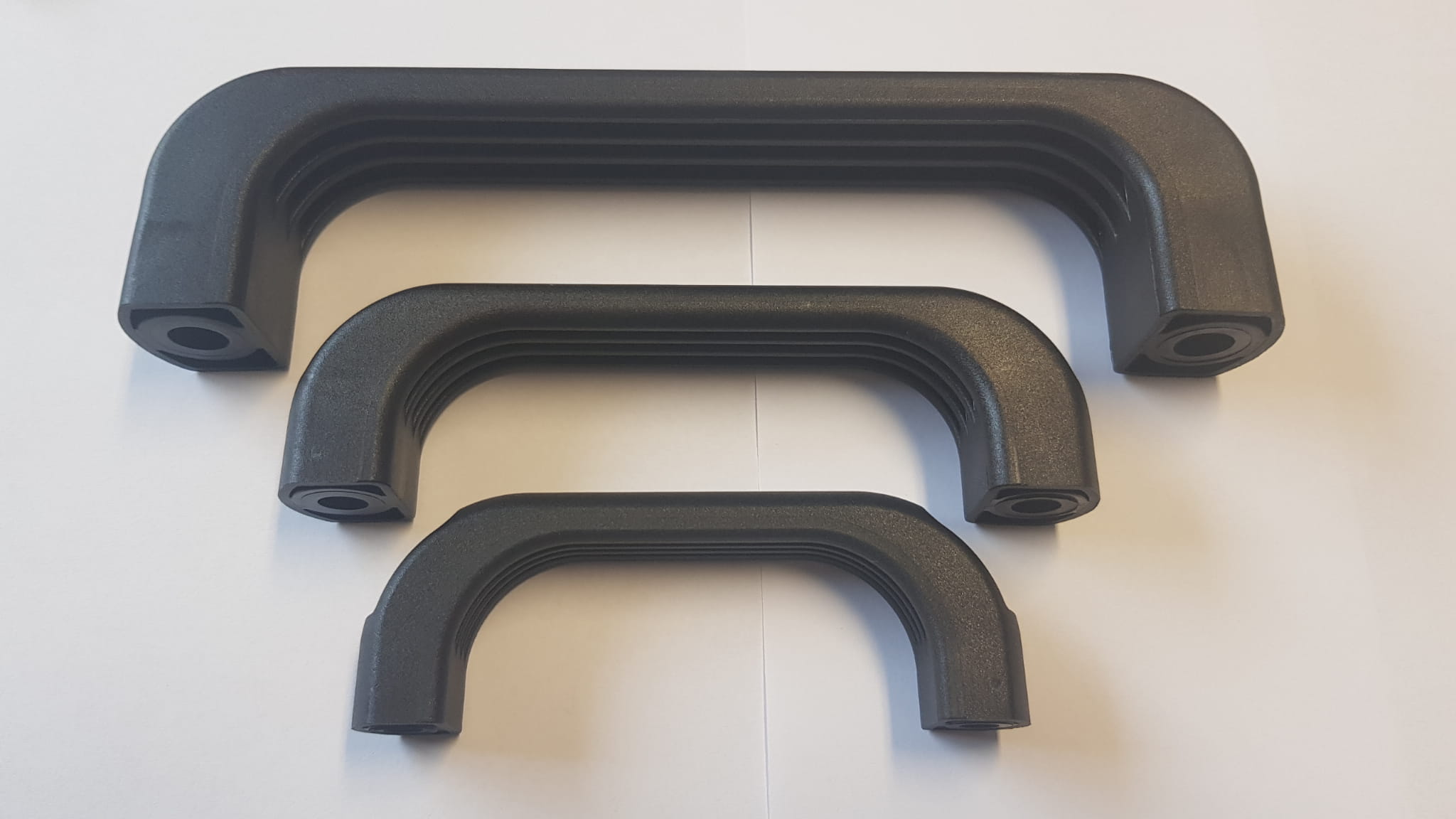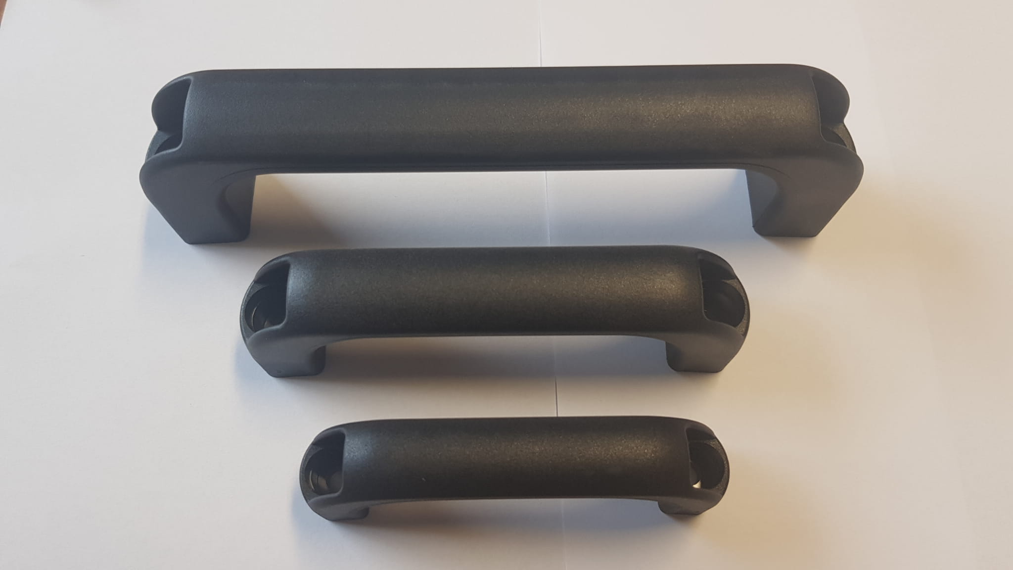 Klamka - uchwyt, czarny, plastikowy, długość 20cm, wysokość 5cm, szerokość 2,8cm. Otwór na śrubę 10,5mm, szerokość otworu 15mm.