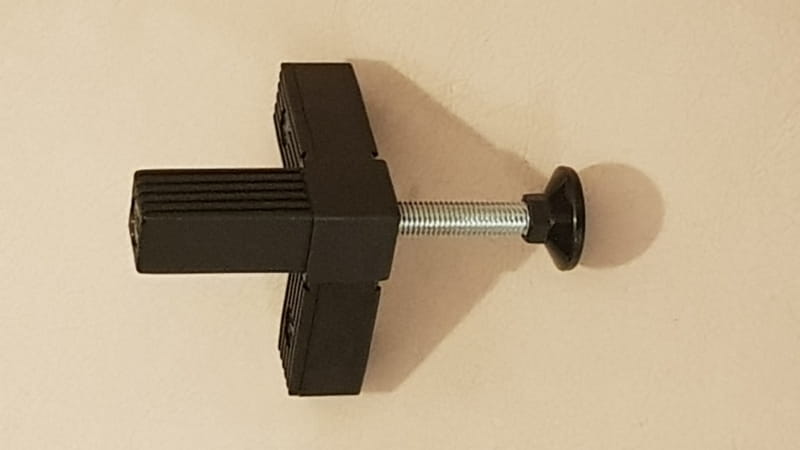 Łącznik zbudowany z poliamidu, dwuczęściowy wewnątrz rura kwadratowa, zgrzewana V15x15x1,5 mm St37 zgodnie z EN 10305-5 (DIN 2395) - wysokie statyczne obciążenia. Gwint o długości 15mm ( wykonany w rurze kwadratowej zgrzewanej a ponadto w osadzonej jej wnętrzu bloku z poliamidu). Stopka z regulowaną wysokością poziomu. Średnica części metalowej stopki 9mm.